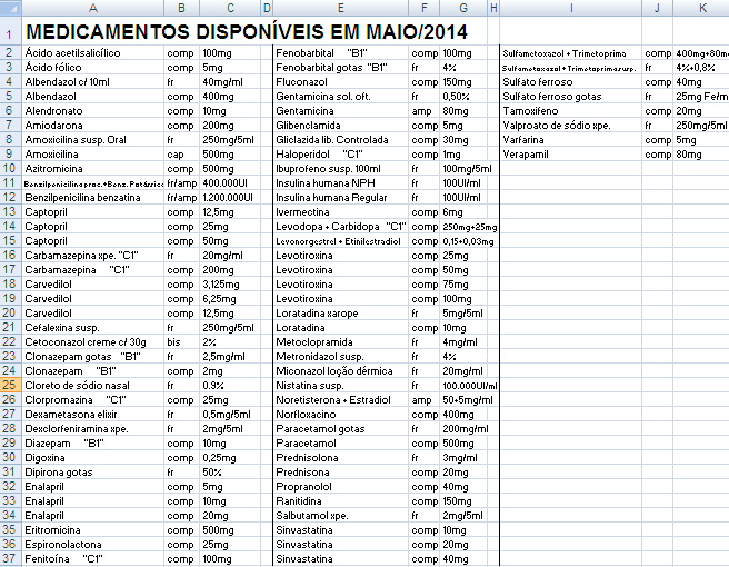 A coordenação da Farmácia Municipal divulgou, hoje, a listagem de medicamentos disponíveis para maio. A lista contém 37 remédios para os mais variados problemas de saúde. Para retirar o medicamento, o paciente deve apresentar a receita original e documento de identidade na Farmácia, que fica na Praça Desembargador Frederico.